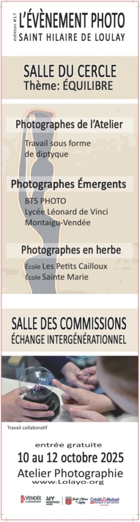 L’Atelier Photographie de LOLAYO présente une programma on riche à Saint-Hilaire-de-Loulay (85) : thématiques originales, projets intergénérationnels, créations d’élèves et de jeunes talents. Une immersion visuelle à découvrir en accès libre.
